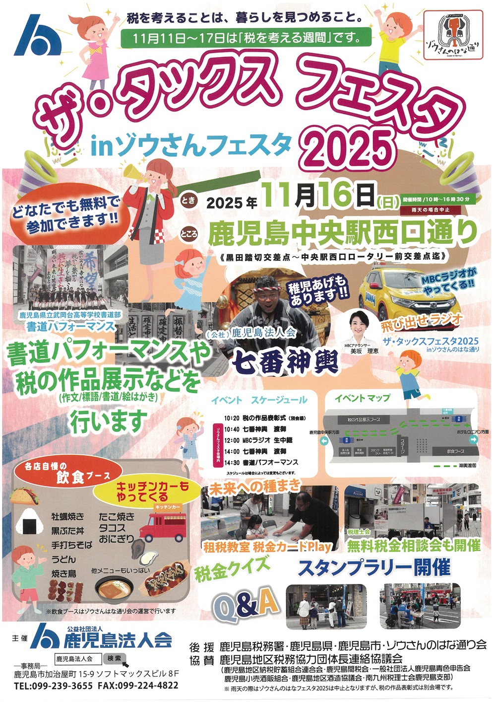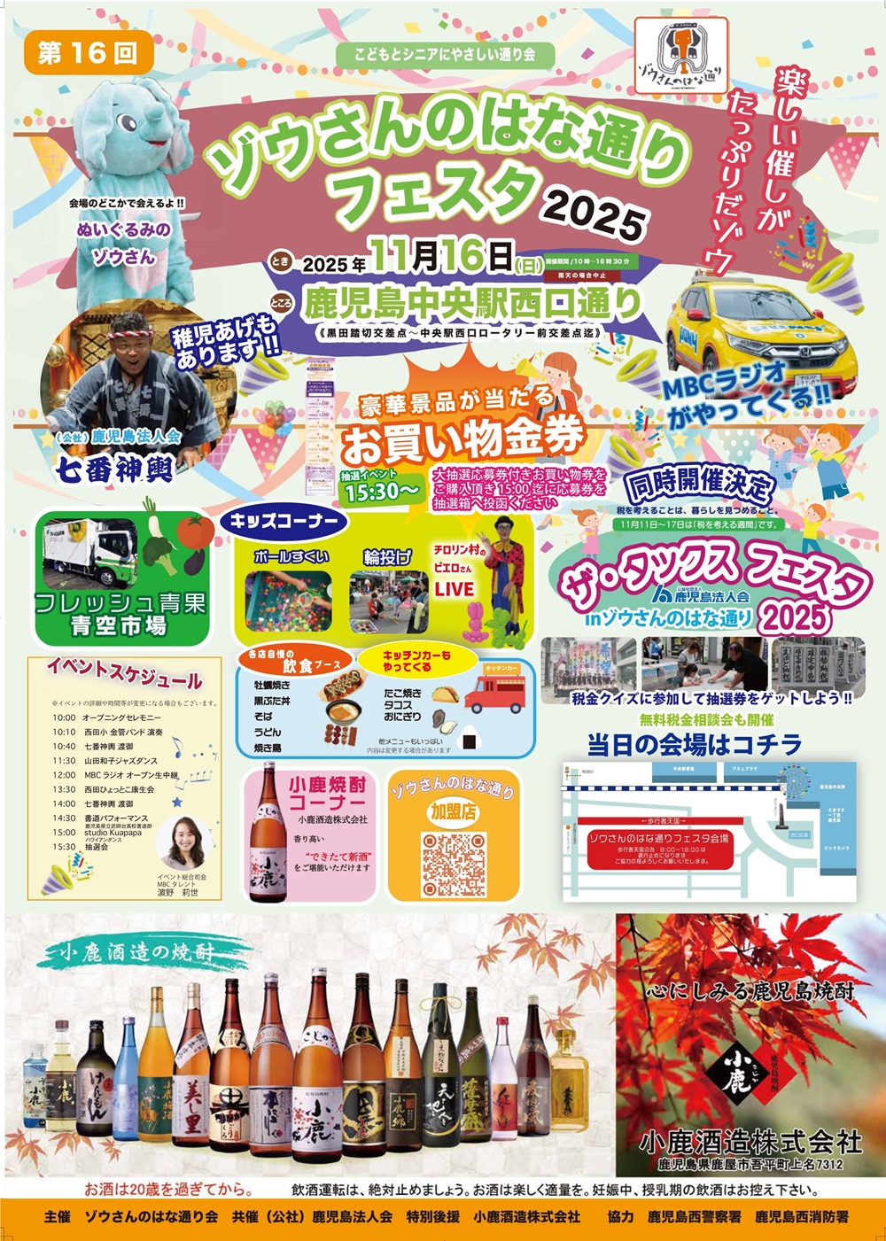 鹿児島の陸の玄関口、鹿児島中央駅西口にあるゾウさんのはな通りで毎年開催されるお祭りですが、今年は鹿児島法人会のタックスフェスタと同時開催となり、盛り上がる事間違いなしです!!